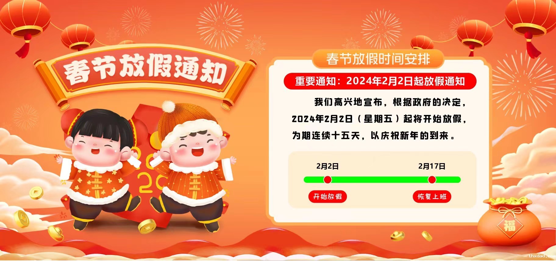 我们高兴地宣布,根据政府的决定,2024年2月2日(星期五)起将开始放假,为期连续十五天,以庆祝新年的到来。